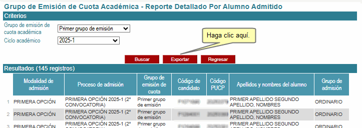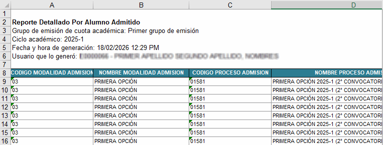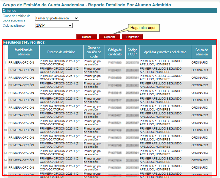 Como resultado de la búsqueda, se mostrará en la parte inferior la relación de los alumnos admitidos pertenecientes a procesos de admisión de pregrado del ciclo académico y grupo de emisión de cuota académica seleccionados.