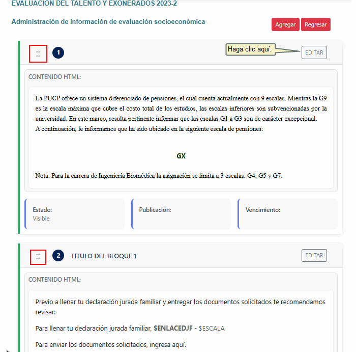 Asimismo, el sistema permite editar la información de los bloques existentes haciendo clic en el botón Editar. También es posible modificar el orden de los bloques haciendo clic en los cuatro puntos que se encuentran junto a cada bloque, y arrastrándolos hacia arriba o hacia abajo según la prioridad deseada.