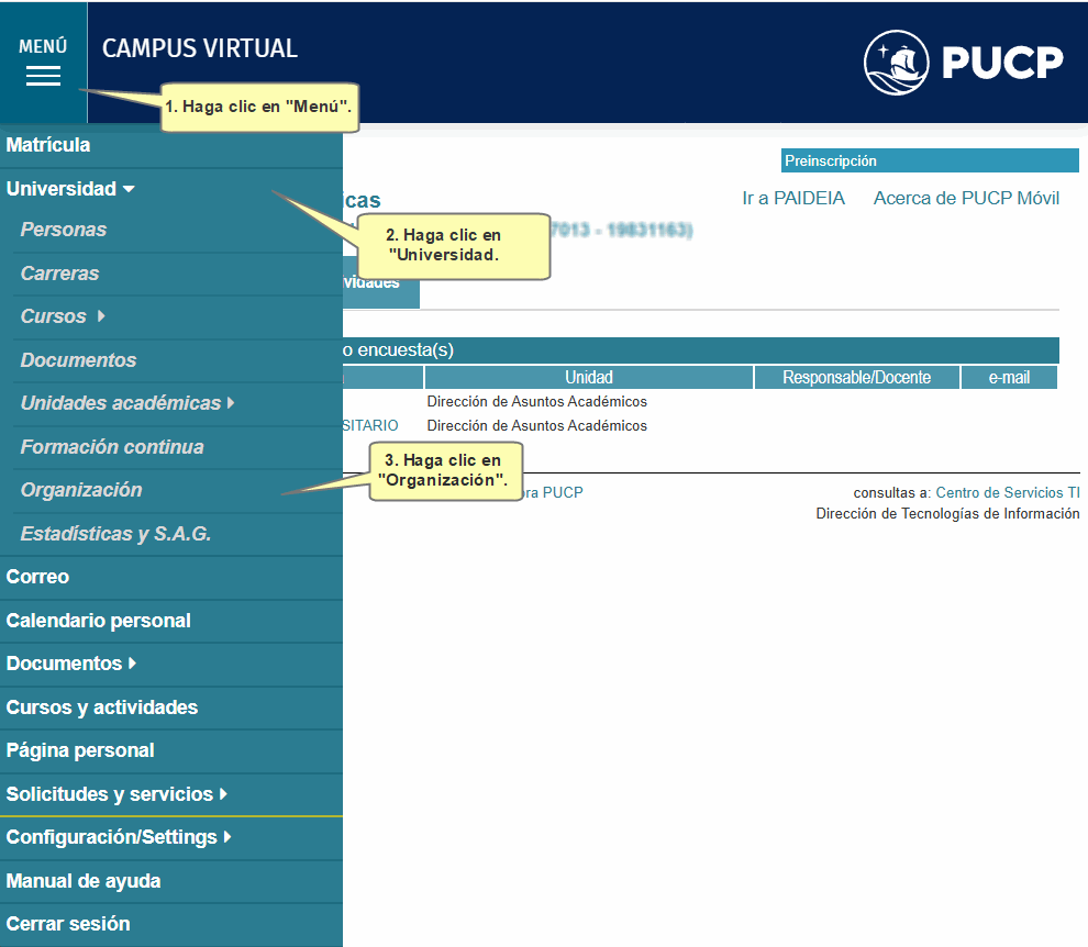 Si es usuario autorizado podrá realizar la configuración de los recordatorios de trámites de alumnos. Para ingresar, en el Menú de campus virtual, haga clic en Universidad y luego en Organización.