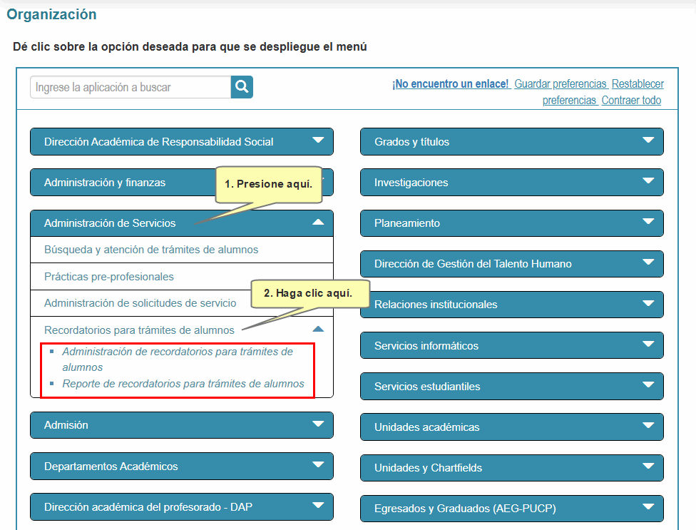 En la sección Administración de Servicios, haga clic en la opción Recordatorios para trámites de Alumnos. Se le mostrarán las siguientes funciones: