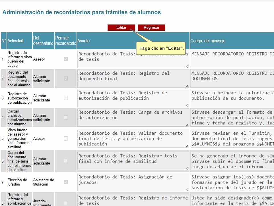 Luego de dar clic en esta función, le aparecerá un listado con las actividades, rol de sus destinatarios y asuntos de cada recordatorio. Para poder editar un recordatorio, presione el botón Editar.