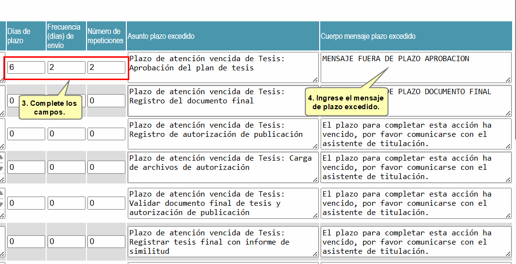 También deberá ingresar el mensaje que se enviará en caso el plazo de la actividad se haya excedido. Este mensaje se enviará al día siguiente del último recordatorio.