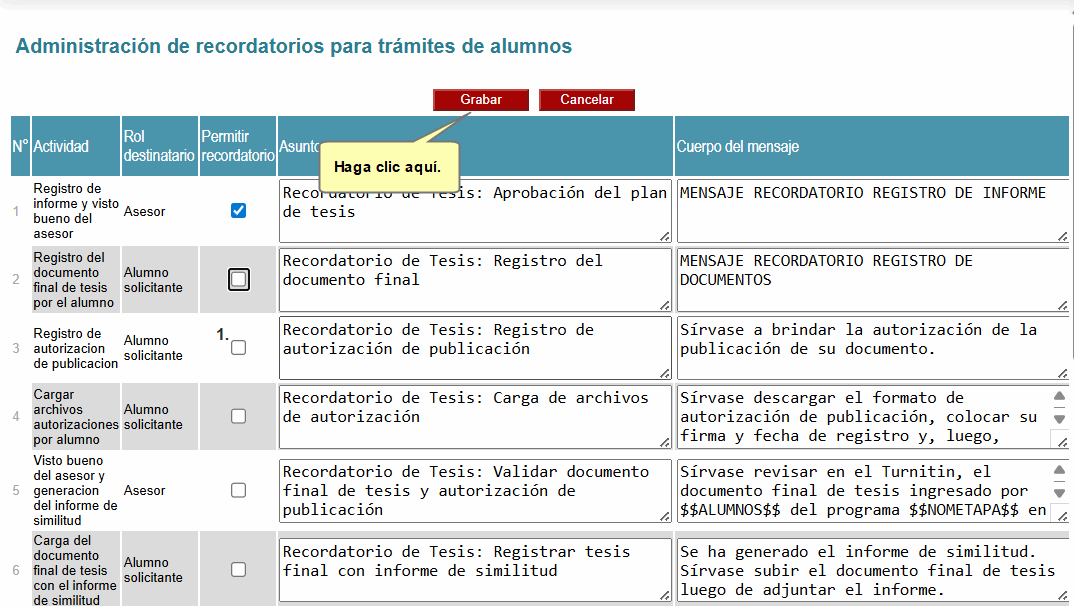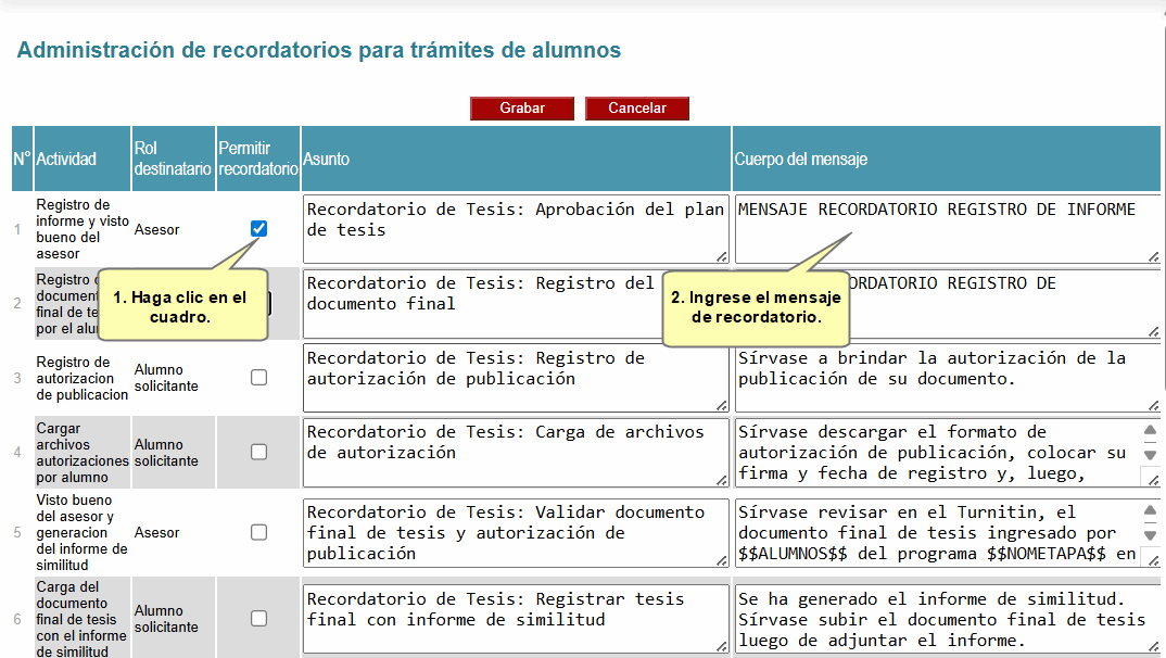 Primero ubique la actividad y el rol del destinatario. Para habilitar el recordatorio, deberá marcar obligatoriamente el recuadro de la columna Permitir recordatorio. Después, ingrese el mensaje del recordatorio que se enviará.