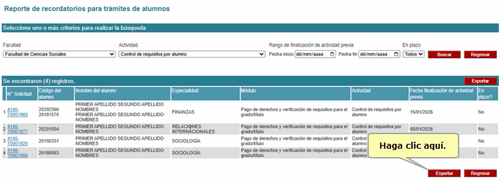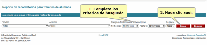 Para generar el reporte de recordatorios para trámites de alumnos, complete los criterios de búsqueda que requiera y presione el botón Buscar.