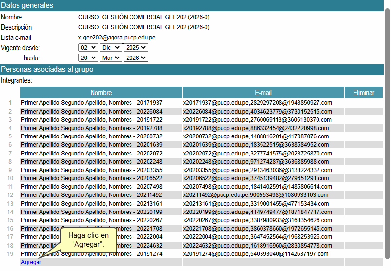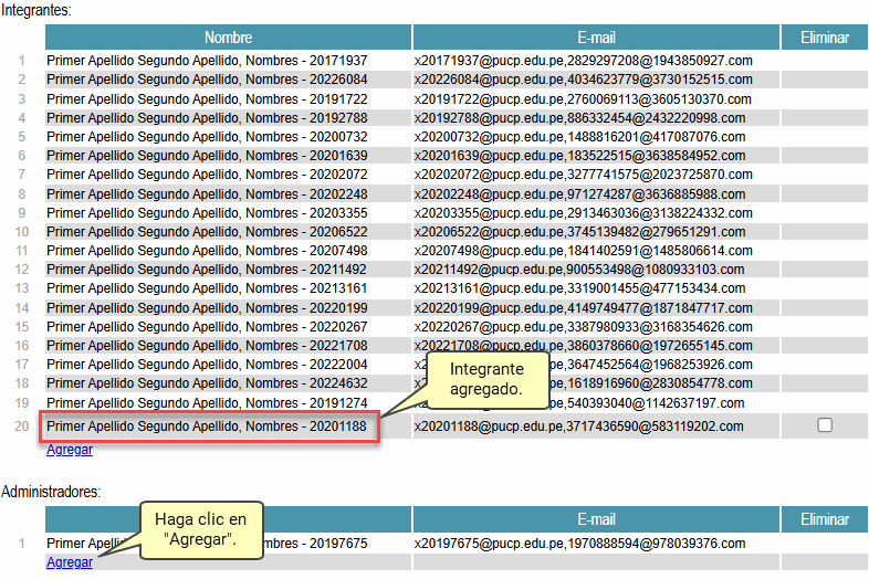 1) Si desea agregar integrantes haga clic en el enlace Agregar correspondiente a la sección Integrantes: