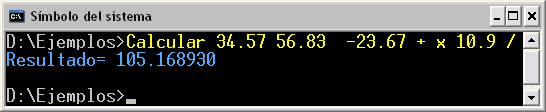 La idea, para este ejemplo es que la expresión sea ingresada através de la línea de comandos. Entonces, la ejecución del programa deberá verse como se muestra a continuación: