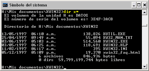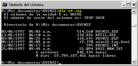 Sin embargo, estos programas pueden cambiar el modo en que se ejecutan si es que permiten colocar parámetros en la línea de comandos. Este es el caso de la orden "dir", que permite colocarlos; por ejemplo, la orden puede darse como "dir x*" o "dir x* /oe". En el primer caso aparecerán sólo los archivos cuyos nombres empiecen con la letra "x" y en el segundo los archivos que empiecen con "x" pero ordenados por su extensión. Las firguras siguientes muestran este concepto: