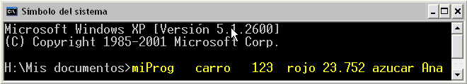 Cuando se ejecute el programa desde la línea de comandos del sistema operativo, si se quiere introducir información al programa por medio de los parámetros, se debe colocar el nombre del programa seguido de una serie de palabras separadas por espacios en blanco. Por ejemplo: