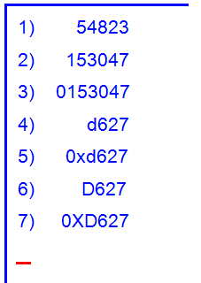 Entero en base hexadecimal sin signo, empleando las letras A,B,C,D,E,F (p.e.: AB7F, 63CE, etc.) |