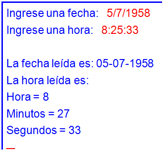 Observe los formatos dados a las funciones scanf, el usuario tendrá que ingresar la fecha y la hora como normalmente se maneja una fecha y una hora, esto es: 5/7/1958 y 8:35:40. Sin embargo el programa, de manera automática, tomará los datos sin tener que hacer una conversión manual de los datos.