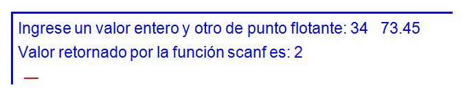 al presionar finalmente la tecla ENTER [↵] el valor de 34 se asignará a la variable a y el valor 73.45 a la variable r. La función scanf devolverá el valor 2 como se aprecia a continuación:
