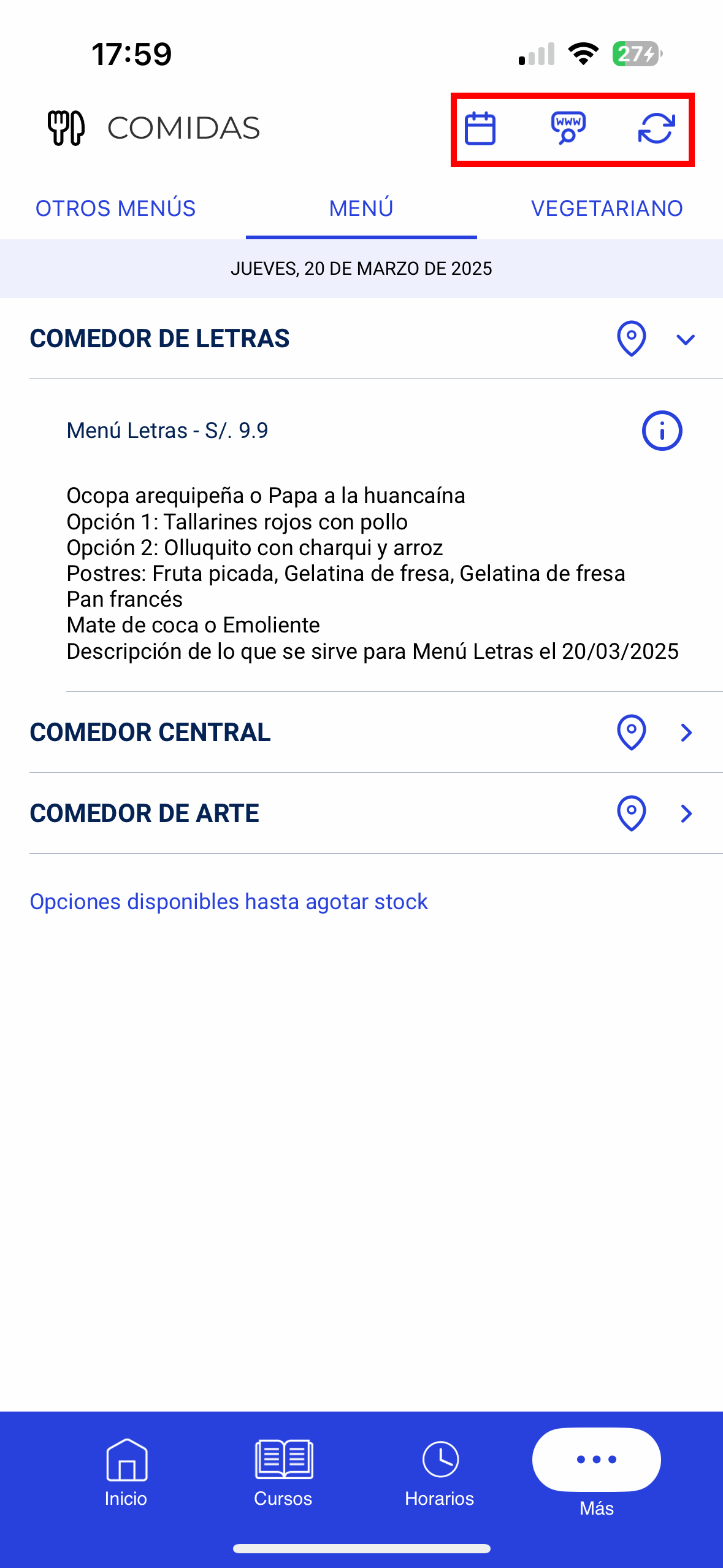 También podrá elegir una fecha y visualizará el plato programado para ese día. Para ver el calendario presione el ícono .