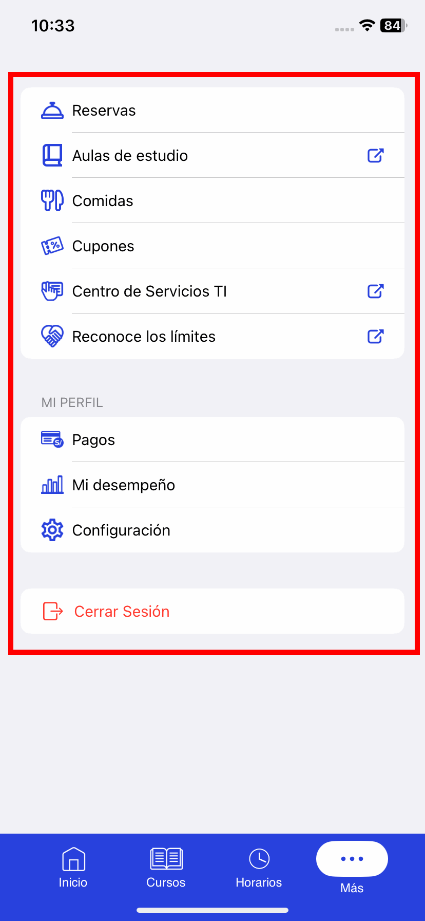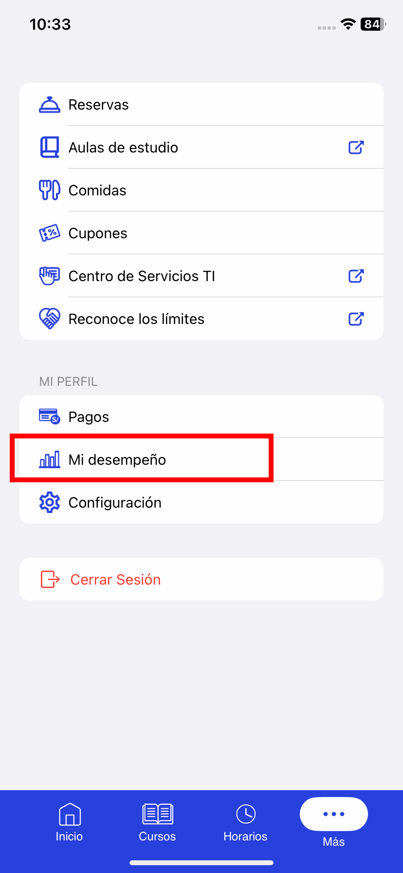 Para acceder a la opción Cursos presione el ícono ubicado en el menú inferior. Visualizará la relación de cursos vigentes regulares y de extensión en los que se encuentra matriculado.