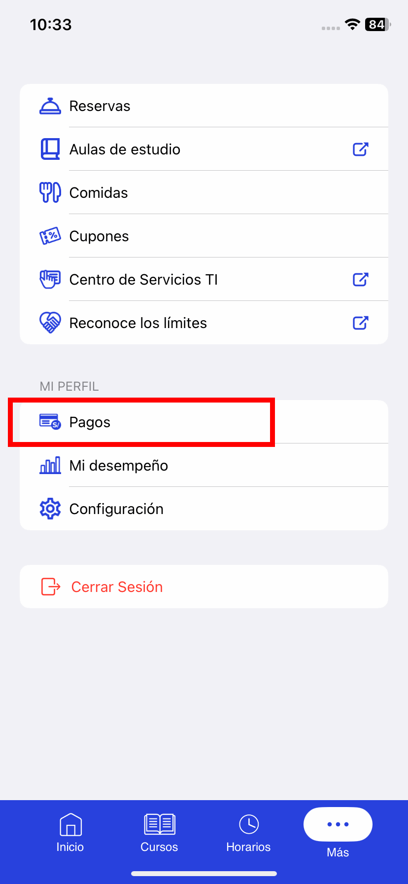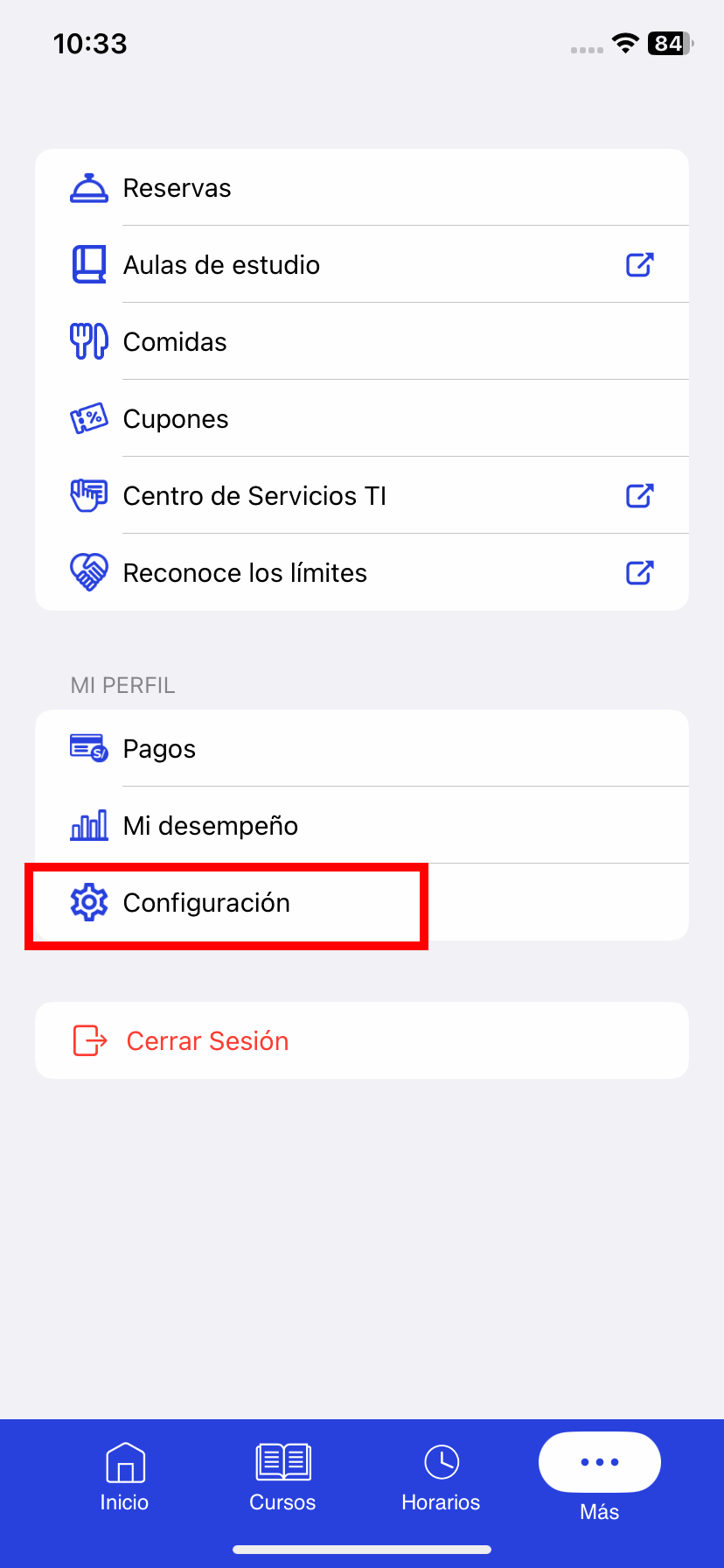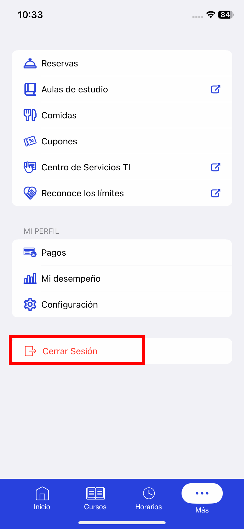 Para cerrar su sesión en PUCP Móvil debe presionar la opción ubicada en el menú inferior, luego presionar la opción .