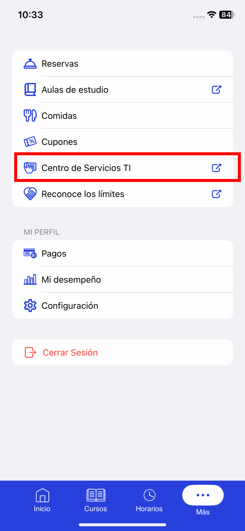 La aplicación lo redireccionará automáticamente al Centro de servicios TI a través de su navegador: https://serviciosdti.ivanticloud.com